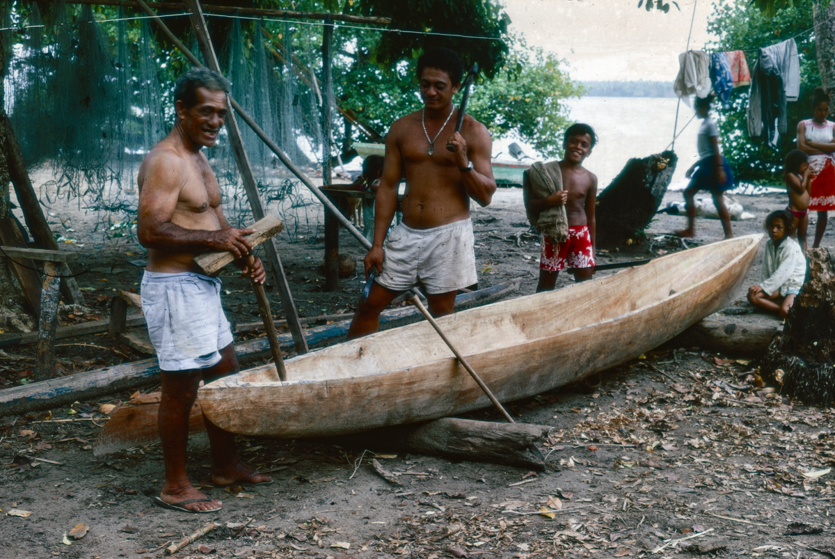 Bibliographical reference: Poignant, A. and Poignant, R. 1976. Children of Oropiro. London: Angus and Robertson, p.8. This extract is from a children's book about children named Eti, Timi, and Sylviane and their life in Raiatea: "On the way they stopped to talk to Hape who was making a canoe. Patiently striking the top of his gouge with a piece of wood, he shaped the hard uru or breadfruit timber of the hull.