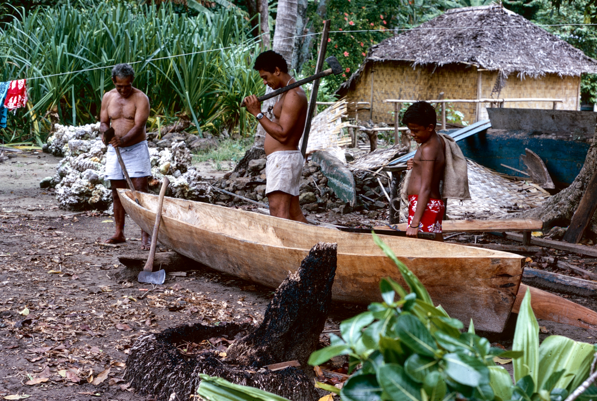 Bibliographical reference: Poignant, A. and Poignant, R. 1976. Children of Oropiro. London: Angus and Robertson, p.8. This extract is from a children's book about children named Eti, Timi, and Sylviane and their life in Raiatea: "On the way they stopped to talk to Hape who was making a canoe. Patiently striking the top of his gouge with a piece of wood, he shaped the hard uru or breadfruit timber of the hull.