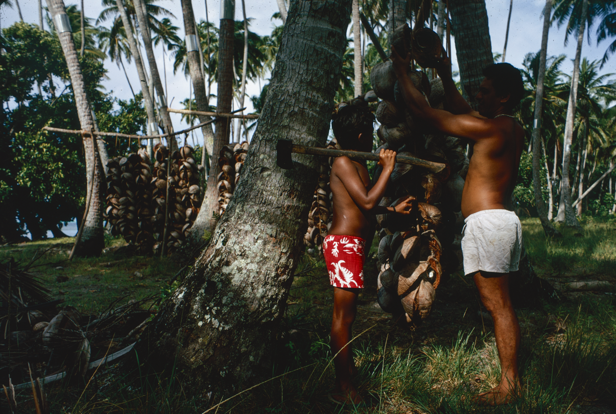 13. Ro'o (father) and Eti hnad [sic. hand] long strings of split coconut in sun to make copra." [Poignant's manuscript]