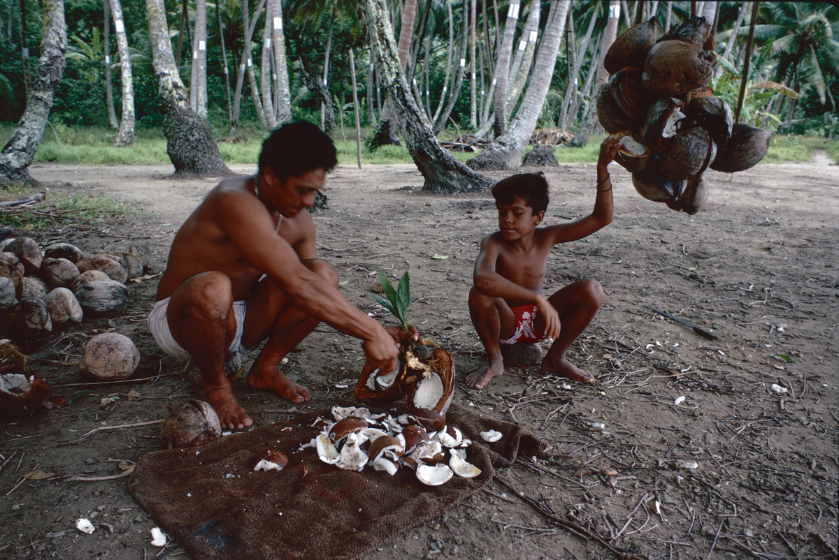 Poignant, A. and Poignant, R. 1976. Children of Oropiro. London: Angus and Robertson, p.9. This extract is from a children's book about children named Eti, Timi, and Sylviane and their life in Raiatea:"In the coconut grove Ro'o and Eti examined the strings of coconuts hanging on loops of hibiscus bark to dry in the wind. Although each nut had been split open, the fibrous husk held the two parts together. This is the simplest way to make copra.
