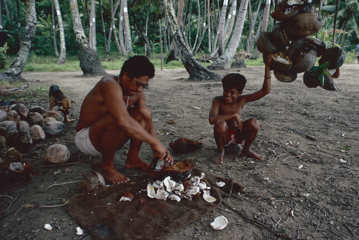 Poignant, A. and Poignant, R. 1976. Children of Oropiro. London: Angus and Robertson, p.9. This extract is from a children's book about children named Eti, Timi, and Sylviane and their life in Raiatea:"In the coconut grove Ro'o and Eti examined the strings of coconuts hanging on loops of hibiscus bark to dry in the wind. Although each nut had been split open, the fibrous husk held the two parts together. This is the simplest way to make copra.