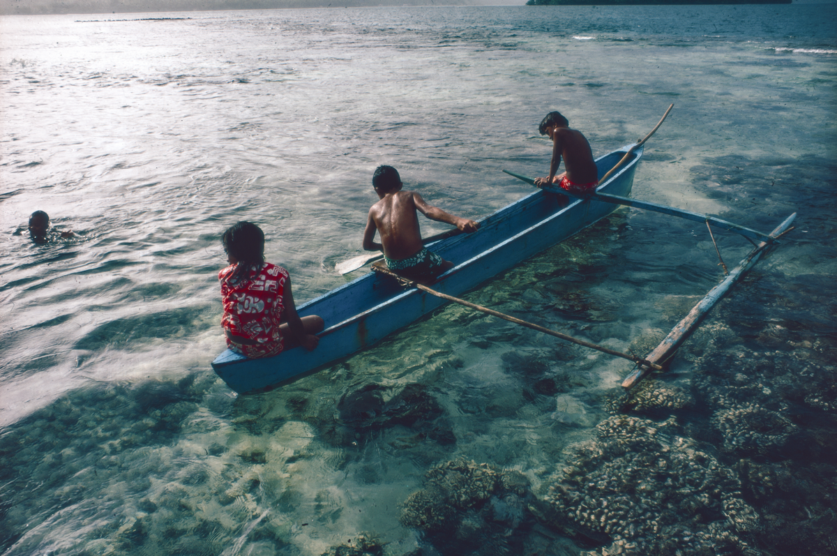 1. children looking over side of canoe at coral." [Poignant's manuscript]