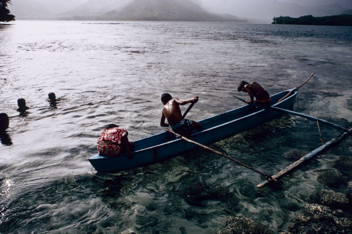 2. children looking over side of canoe at coral." [Poignant's manuscript]