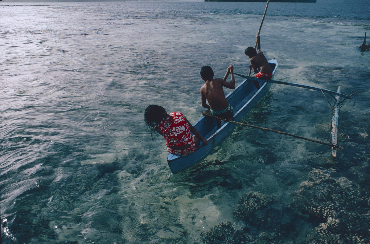 4. children looking over side of canoe at coral." [Poignant's manuscript]