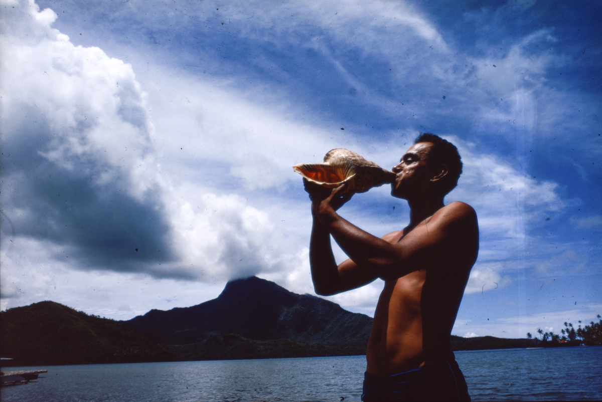 10. several different angles of Turo blowing shell trumpet to raise alarm." [Poignant's manuscript]