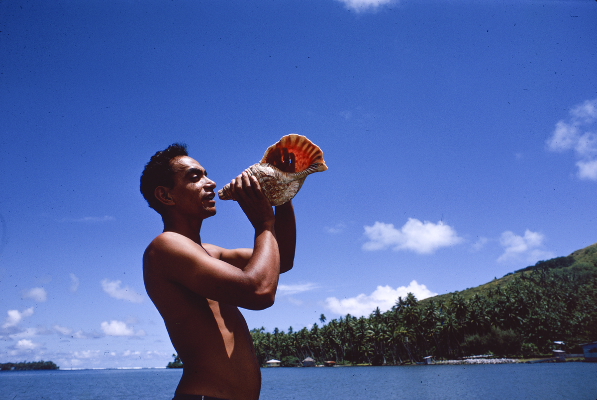 13. several different angles of Turo blowing shell trumpet to raise alarm." [Poignant's manuscript]