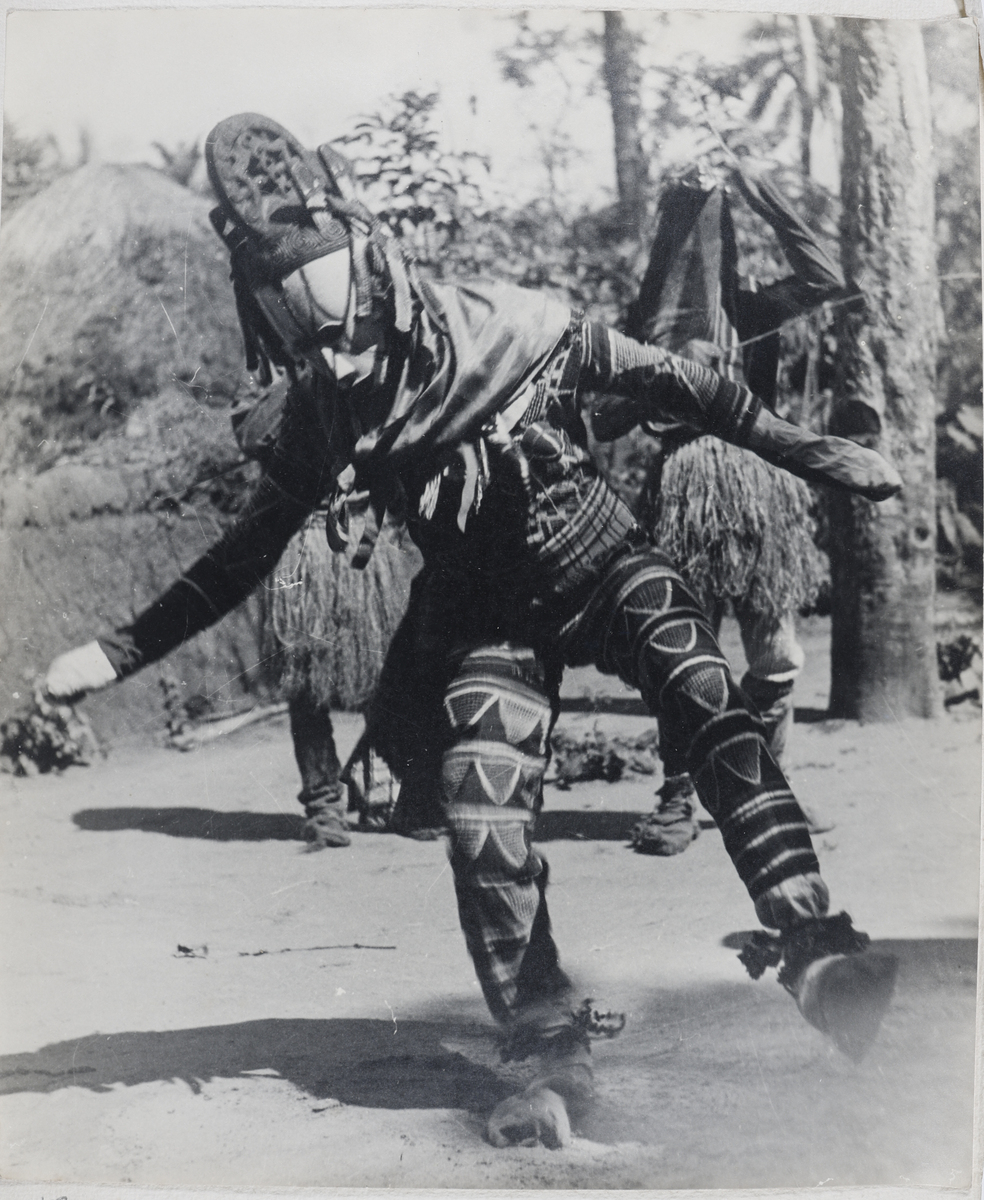 A masquerader, Nwaogho Ehi, (Heifer), is dancing. He is wearing a helmet mask (painted white and with v-shaped markings above and below the eyes)dressed in a brightly coloured harlequin-like/appliqué costume. He has a cloth cloak tied around the neck, over woven? or net? cloth which is attached to the mask, wrappers around the waist and ankle-rattles (made of seeds?). Mud and thatch houses and trees and vegetation in the background. [Description from record T.170109.GIJ, PB 02/08/2024]