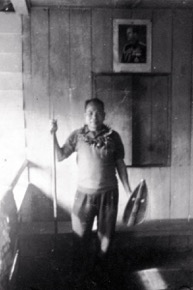 Paka anak Otor stands at the base of his raised wooden hous…