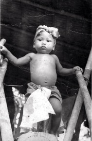 Toddler Kenid anak Paka, wearing a headscarf and shorts wit…