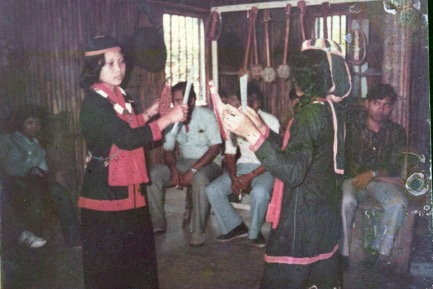 Two young women, both wearing adat gawai (pre-Christian rit…