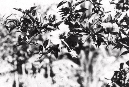A collection of foliage, including possibly a cactus plant,…