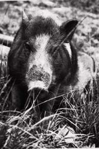 Close-up photograph of a wild boar sitting amid tall grass.
