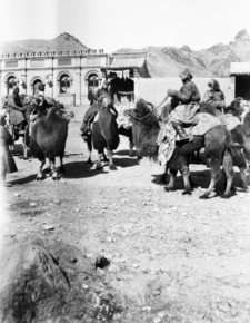 Camel-mounted Mongols, Kalgan [Zhangjiakou]; 6 men on camel…