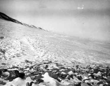 Dead Mongol Pass; snowy plain, rocky forefront, mountains o…