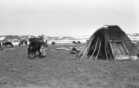 Kazaks [Qazaqs] (Torgut) [?] by yurt; starting to assemble …