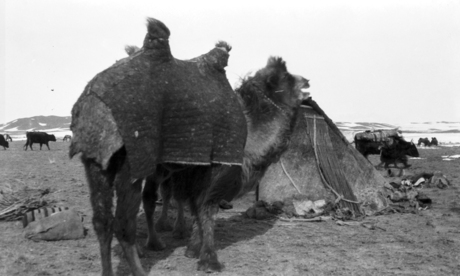 Camel in winter coat; yurt and oxen in background