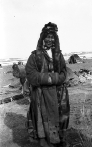 Kazak (Qazaq) yurt partially covered yurt; woman standing b…