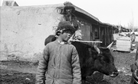 Boy with ox; actually boy standing in front of a man riding…
