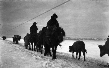 Kazaks (Qazaqs) on move (yurt) [?] 2 men on horses, several…