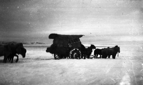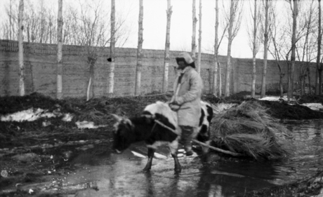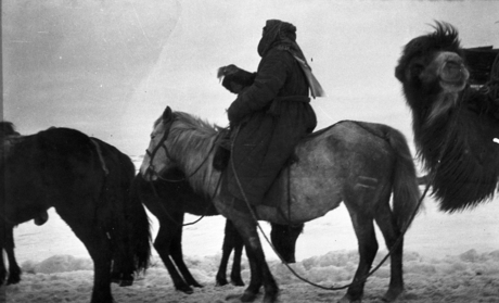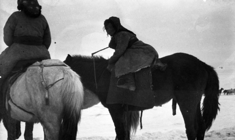 Kazak (Qazaq) women on horse; with small child in her lap; …