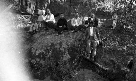 Grape Valley picnic; men and boys sitting on the edge of a …