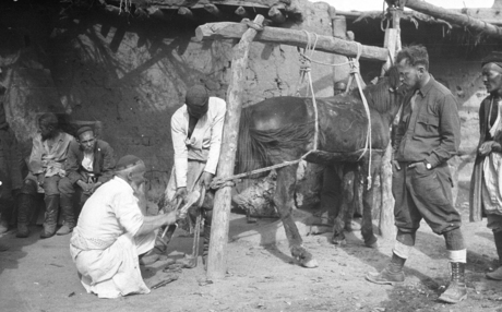Horseshoeing farrier with an assistant; Uighur working on h…