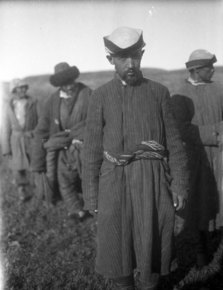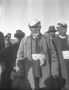 Kazak (Qazaq) chief; close up of chief with several men sta…
