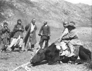 Two Kazak (Qazaq) boys on ox, Koksu (Kok-su); mountainous r…