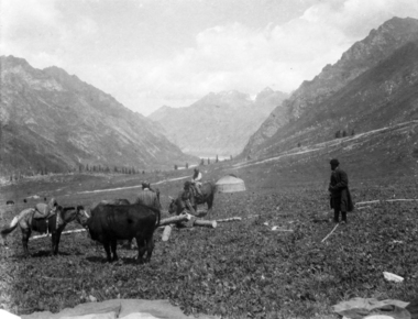 Turki (Uighur) encampment Kichik Yailak; several men and ho…