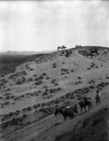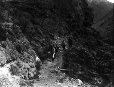 Brushwood bridges, upper Koksu (Kok-su); man leading pack h…