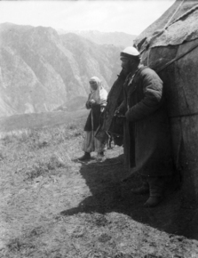 Kazak (Q) encampment, lower Koksu; man and woman standing b…