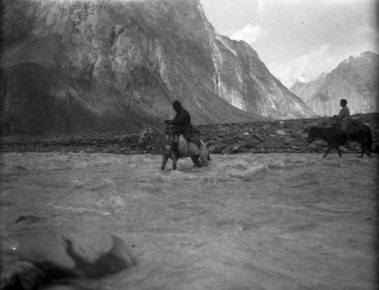 Lower Muzart, Moses fording; two men on horses fording river