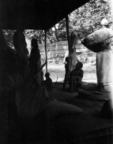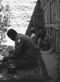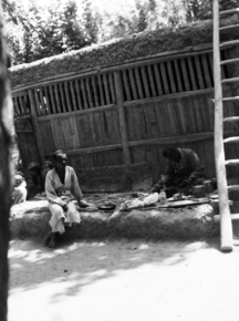 Sanju bazaar: Moses cooking; Moses in front of wooden build…