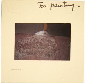 Close-up of part of a mural featuring red pigment and geome…