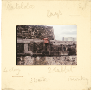 Close-up of Aztec “day signs” carved on the side of a stone…