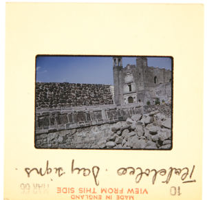 View of brick platforms at Tlatelolco, with a church and co…