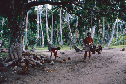 Ro'o, a man from Fetuna, processing coconut on a mat to mak…