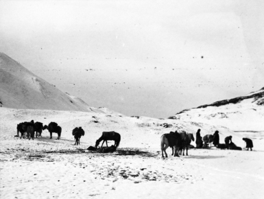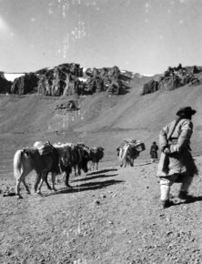 Near top, Karakorum Pass; loaded horses with 2 men walking …