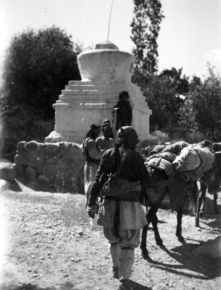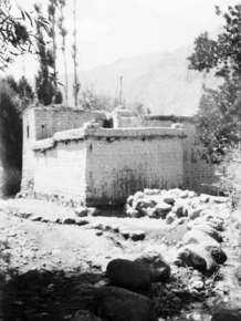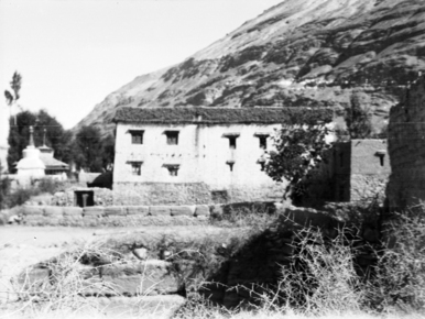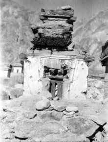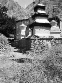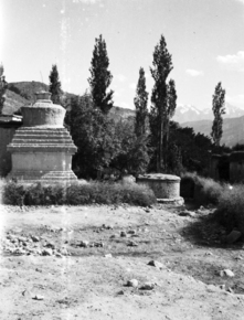 (Buildings and) chorten at Panamik; chorten with poplar tre…