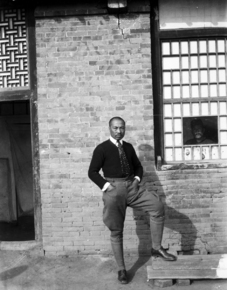 Tseu 'Liu-yeh'; man in western attire, posing in front of b…