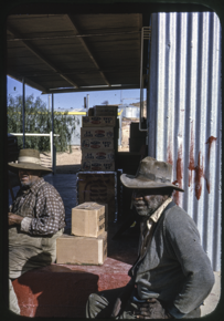 "Coober Pedy. Abo [Aboriginal] men at Reserve store.”