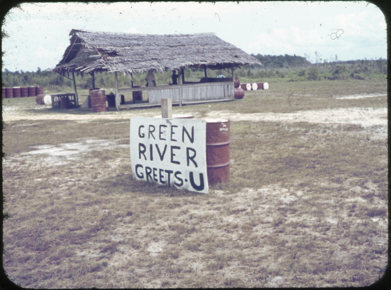 A Hand-painted sign reading "GREEN RIVER WELCOMES U", mount…