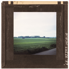 View of a landscape of fields growing crops, with a road in…