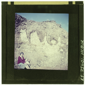 A woman sitting at the base of a cliff face, probably at th…