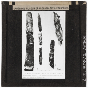 Documentary photograph of a bone sickle-hafts, and two flin…