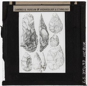 Documentary drawing of eight Paleolithic stone tools, likel…
