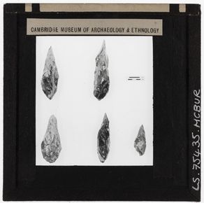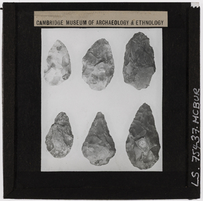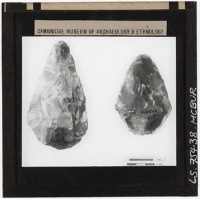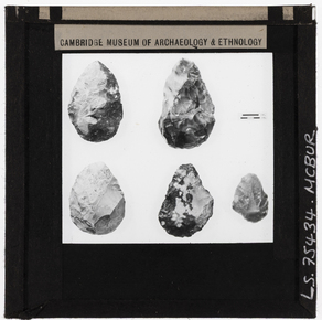 Documentary drawing of six Paleolithic stone tools, probabl…