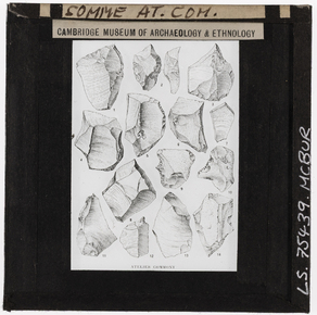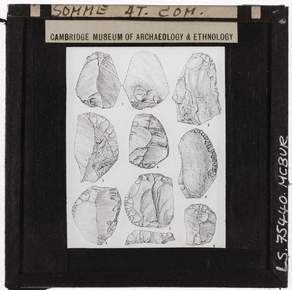 Documentary drawing of fourteen Paleolithic stone tools, li…