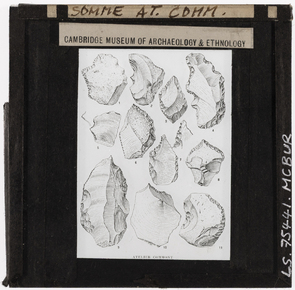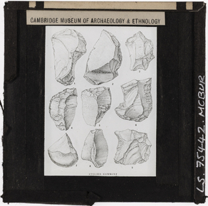 Documentary drawing of nine Paleolithic stone tools, likely…