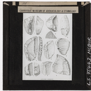 Documentary drawing of nine Paleolithic stone tools, likely…